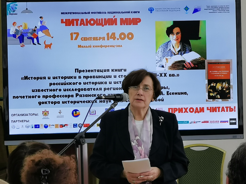 В малом конференц-зале библиотеки в рамках фестиваля «Читающий мир» при содействии Рязанского библиотечного общества состоялась презентация книги «История и историки в провинции и столицах XVIII–XX вв.», изданной в издательстве «Квадрига» (г. Москва). Автор – российский историк, историограф, источниковед, исследователь региональной культуры, доктор исторических наук, почетный профессор Рязанского государственного университета им. С.А. Есенина Алла Севастьянова.