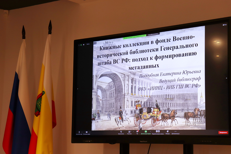 С докладом о книжных коллекциях в фондах Военно-исторической библиотеки Генерального штаба Вооруженных сил Российской Федерации выступила по видеосвязи Екатерина Поддубная, магистр, ведущий библиограф Информационного историко-научного центра – Военной исторической библиотеки Генерального штаба. Была дана небольшая историческая справка об истории библиотеки и ее фонде, который в XIX в. являлся вторым по величине после библиотеки Румянцевского музея. Богатейшие коллекции великих князей, военных деятелей, полковых библиотек и различных военных учреждений ждут своего выявления и изучения.