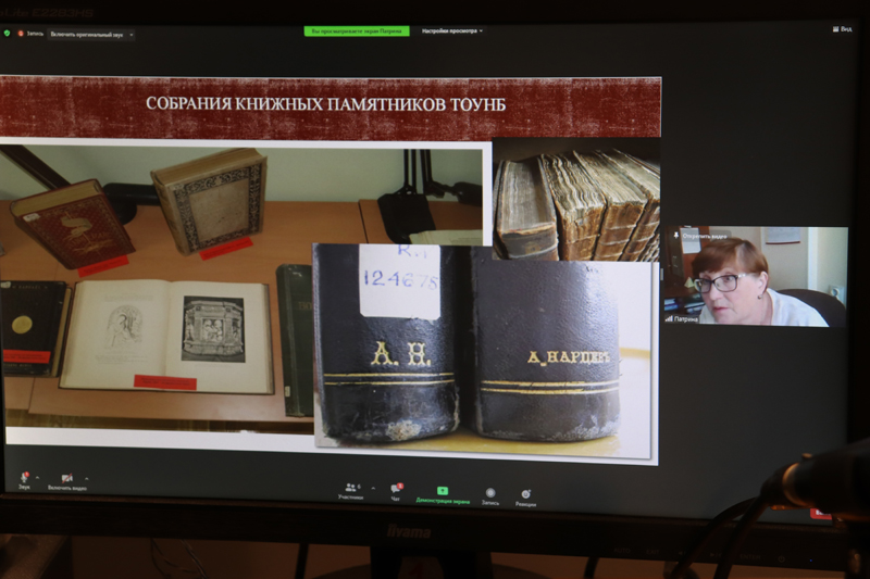 О деятельности Смоленской областной универсальной научной библиотеки им. А.Т. Твардовского в популяризации книжных памятников и редких книг рассказала по видеосвязи Елена Приставкина, заведующая сектором редких книг.