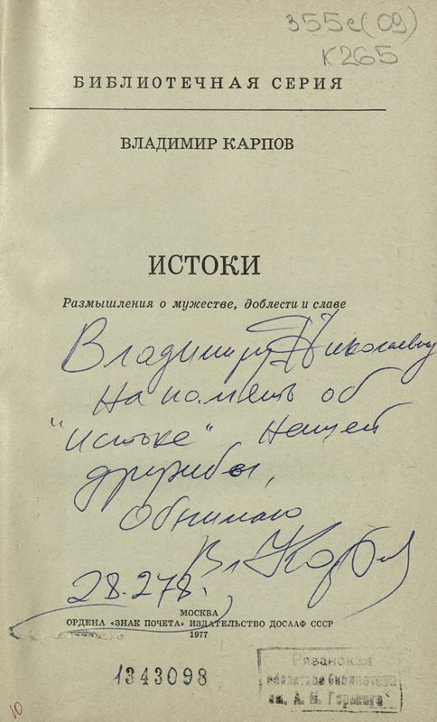 Великая Победа мая 1945 года побуждает нас с уважением и благодарностью вспоминать солдат Великой Отечественной войны. В фонде библиотеки им. Горького в «Коллекции автографов» хранится книга Героя Советского Союза, участника Великой Отечественной войны Владимира Карпова с авторским автографом.