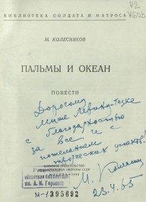 В 1962 году уволился в запас в звании полковника и посвятил себя писательскому делу. В 1972 году получил премию Министерства обороны СССР за дилогию «Все ураганы в лицо» и «Без страха и упрека». В «Коллекции автографов» в фонде нашей библиотеки хранится книга Колесникова «Пальмы и океан» с автографом: «Дорогому Мише Левину –тезке с благодарностью за все и с пожеланием творческих успехов!» Дарственная надпись предназначена Минелю Иосифовичу Левину – прозаику, поэту и публицисту.