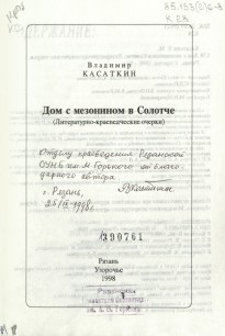 Владимир Михайлович был страстным краеведом-исследователем, им опубликовано более 600 научных и научно-популярных статей в газетах и журналах. Кроме того, на его счету три книги: «Род Олениных», «Вторая родина» Константина Паустовского» и «Дом с мезонином в Солотче». В 2010 году В.М. Касаткин был награжден почетным знаком «За заслуги перед городом Рязанью». Умер этот замечательный человек 22 апреля 2011года.