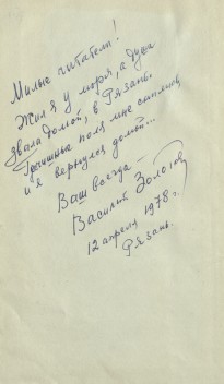 С 1954 года Василий Антонович Золотов – член Союза писателей СССР. С 1960 по 1970 гг. он руководил русской секцией Союза писателей Латвии. В 1970–1977 годах жил и работал на Камчатке, был первым помощником капитана плавбазы «Ламут». В 1977 году переехал в Рязань. С 1984 по 1990 гг. являлся ответственным секретарем Рязанской писательской организации. При участии Василия Антоновича Золотова были возобновлены литературные чтения на сасовской земле, посвященные Новикову-Прибою.