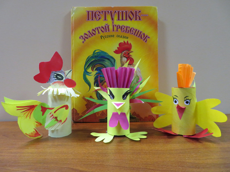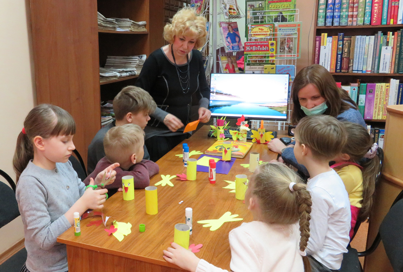 Сотрудники кафедры детской литературы областной библиотеки имени Горького провели мастер-класс по изготовлению бумажной игрушки для участников клуба выходного дня «Домовенок». На занятии, приуроченном к Всероссийской неделе детской книги, дети изготовили из картонных втулок и цветной бумаги знаменитого героя многих сказок – петушка. Эта птица считалась на Руси символом солнца, зари и плодородия.
