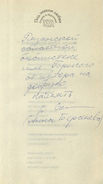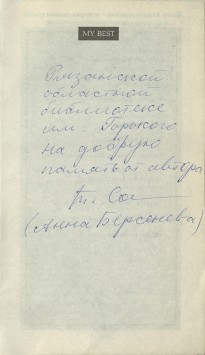 Интересно, что в «Коллекции автографов» Рязанской областной библиотеки имени Горького хранятся три книги с автографами Анны Берсеневой, которые попали в коллекцию в рамках Межрегионального фестиваля национальной книги «Читающий мир» 2018 года. Настоящим подарком для рязанских читателей стала встреча с популярными писателями Анной Берсеневой и её супругом Владимиром Сотниковым, в память о которой она подписала книги своего авторства из фонда нашей библиотеки. Познакомиться с этими изданиями можно в читальных залах библиотеки.