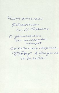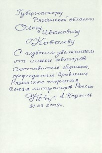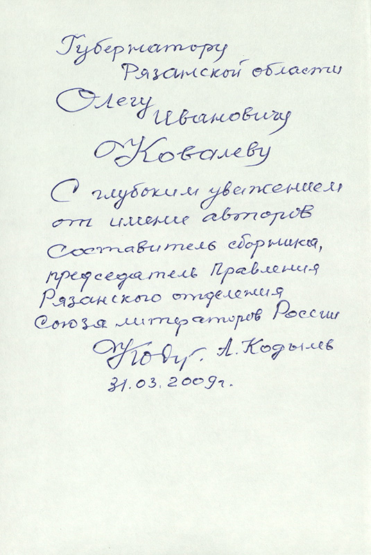 В издании «Давайте познакомимся. О жизни и творчестве членов Союза литераторов России (Рязанское отделение)» (2008) есть инскрипты: «Читателям библиотеки им. Горького. С уважением от коллектива авторов, составитель сборника А. Кодылев. 10.10.2008 г.». Второй экземпляр этой книги адресован «Губернатору Рязанской области Олегу Ивановичу Ковалеву с глубоким уважением от имени авторов, составитель сборника председатель Правления Рязанского отделения союза литераторов России А. Кодылев. 31.03.2009 г.».