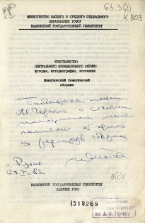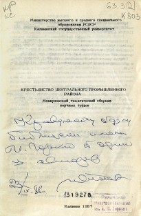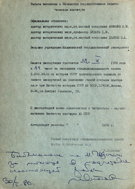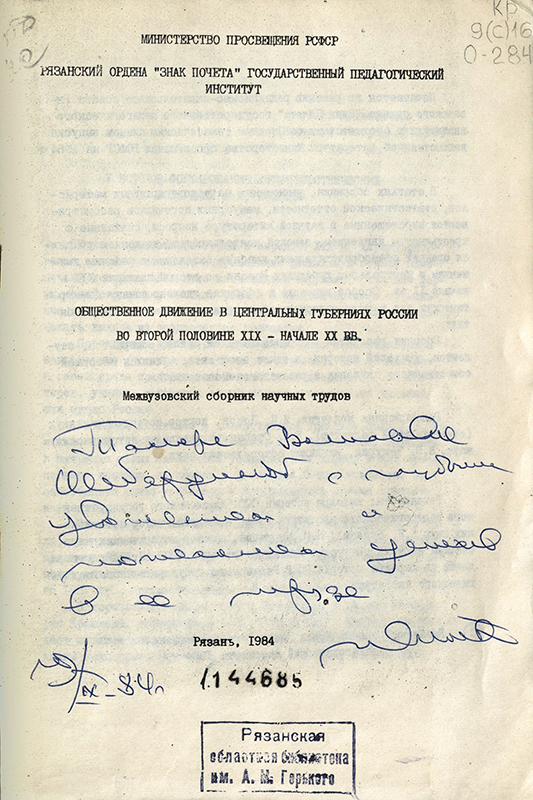 Автограф в сборнике «Общественное движение в центральных губерниях России во второй половине XIX – начале XX века» адресован «Тамаре Васильевне Шабардиной с глубоким уважением и пожеланием успехов труде. 9.09.1984 г.». Т.В. Шабардина (1938–1987), заведующая библиографическим отделом областной библиотеки имени Горького (1978–1984), в последующем секретарь Рязанского обкома профсоюзов работников культуры (1984–1987).