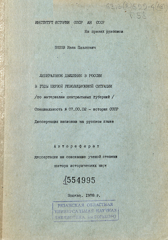 - Попов И. П. Либеральное движение в России в годы первой революционной ситуации (по материалам центральных губерний): автореф. дис. на соискание ученой степ. д-ра истор. наук / И.П. Попов ; Ин-т истории СССР АН СССР. – Москва, 1978. – 44, [1] с.