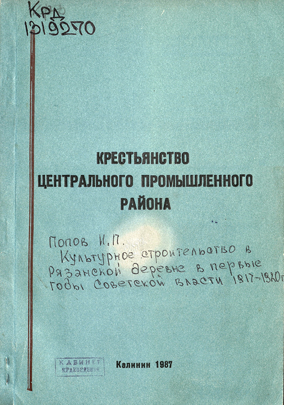 Экземпляр сборника «Крестьянство центрального промышленного района: история, историография, источники» (1982), в котором вышла статья И.П. Попова «“Трезвенное движение” крестьян Калужской губернии в годы первой революционной ситуации», адресован «Библиотеке имени М. Горького с самыми наилучшими пожеланиями от одного из редакторов сборника г. Рязань 27.01.1983 г.».