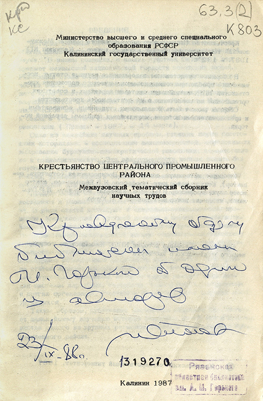 Инскрипт «Краеведческому отделу библиотеке им. Горького от одного из авторов 23.09.1988» есть в сборнике научных трудов «Крестьянство Центрального промышленного района» (1987) от автора статьи И.П. Попова «Культурное строительство в Рязанской деревне в первые годы Советской власти (1917–1920)».