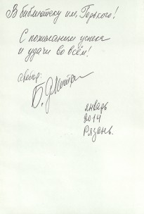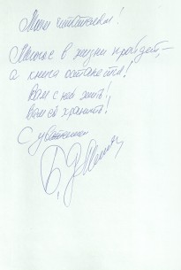 Дарственные надписи украшают два экземпляра книги «Наедине с минувшим»: «Моим читателям! Многое в жизни пройдет, – а книга останется! Вам с ней жить! Вам её хранить! С уважением Б. Дмитриев», «Моим читателям! Как мог, рассказал о себе! И Вы не молчите! Неинтересных людей нет! Просто некоторые об этом не догадываются. С пожеланием всего доброго! Автор Б. Дмитриев. 01.12.2012. Рязань».