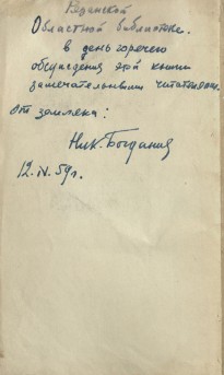 В 1972 году писатель посетил родные места. Во время встречи с читателями библиотеки им. Горького он оставил дарственную надпись на книге, которая хранится в «Коллекции автографов». В фонде нашей библиотеки есть все произведения писателя, а в электронной библиотеке имеются цифровые копии книг «Рассказы о войне» (1941) и «Юрий Смирнов» (1945). Теперь у вас есть возможность читать книги Николая Богданова виртуально.
