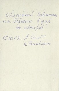 Надпись «Областной библиотеке им. Горького в дар от авторов. 15.10.2003» в книге «Лирический диалог», состоящей из двух сборников Л. Салтыковой «Аленькая зоренька» и А. Бандорина «Зеленый взор», – это беседа-размышления двух лирических героев, женщины и мужчины, о любви и о жизни.