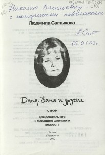 - Салтыкова Л.Ф. Даня, Ваня и другие : стихи : для дошкольного и младшего школьного возраста / Л. Салтыкова ; [иллюстрации: Е. В. Дыкина и др.]. – Рязань : Узорочье, 2002. – 47 с. : ил., портр.