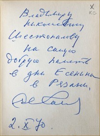 В «Коллекции автографов» Рязанской областной универсальной научной библиотеки имени Горького хранится книга С.В. Михалкова «Стихи», вышедшая в 1959 году в серии «Библиотека советской поэзии». Судя по дарственной надписи автора, адресованной заведующему отделом пропаганды и агитации Рязанского обкома КПСС Владимиру Николаевичу Шестопалову, сборник был подарен накануне проведения праздника в селе Константиново, на родине Сергея Есенина. 3 октября 1970 года в Доме культуры состоялся литературно-музыкальный вечер, посвященный 75-летию со дня рождения поэта, на котором выступил председатель правления Союза писателей РСФСР С.В. Михалков. Он сказал много теплых слов о творчестве нашего знаменитого земляка, о месте и значении его поэзии в советской литературе.
