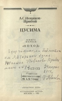 Книга повестей и рассказов А.С. Новикова-Прибоя (1988) была подарена сотруднику читального зала областной библиотеки с надписью: «На доброе знакомство и в благодарность за гостеприимство. 24.03.2007», издание подарено в библиотечный фонд.