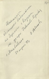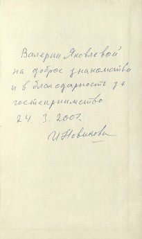 В «Коллекции автографов» «Горьковки» есть пять книг с дарственными надписями. Инскрипты И.А. Новиковой адресованы Рязанской областной библиотеке имени Горького и заведующей читального зала Валерии Яковлевой.