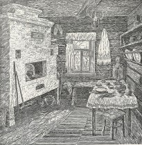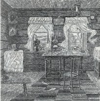 Художник вдумчиво, незатейливо воплотил в гравюре тот особый, дорогой нам мир есенинской поэзии, изобразил атмосферу, что с рождения питала будущего великого поэта. Какая светлая радость бытия выплескивается в гравюрах «На кухне» (1982), «Горница светлая» (1989). В деревенских бытовых интерьерах проявляется красота и значимость простых привычных предметов в доме: стол, лавка, керосиновая лампа, божница, книжки, исписанные листочки, распахнутые окна, а за ними бескрайнее пространство лугов, неба, реки... Это тот мир, в котором жил поэт, его семья, все то, что волновало и было любимо.