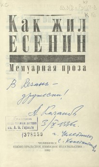 В книге воспоминаний В.Ф. Наседкина «Последний год Есенина» (Челябинск, 1992) – автограф А.Л. Казакова, подготовившего текст к печати и вступительную статью к одной из редких и лучших книг, долгое время находившейся под запретом.