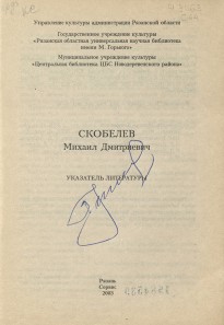 - Скобелев Михаил Дмитриевич : указатель литературы / Управление культуры администрации Рязанской области; ГУК «Ряз.обл.унив.науч. библ. им. Горького», МУК «Центр.библ. ЦБС Новодеревенского района» – Рязань, 2003. – 80 с.