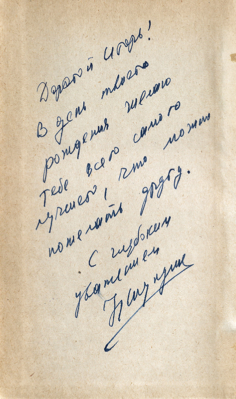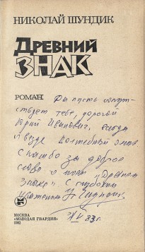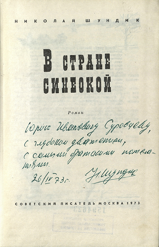 В «Коллекции автографов» «Горьковки» есть три книги с подписью Николая Елисеевича Шундика. На титульном листе романа «В стране синеокой» (1973) есть дарственная надпись: «Юрию Ивановичу Суровцеву, с глубоким уважением, с самыми братскими пожеланиями Н. Шундик 26.04.1973 г.». Книга «Древний знак» (1982) имеет инскрипт: «Да пусть сопутствует тебе, дорогой Юрий Иванович, всегда и везде волшебный олень. Спасибо за доброе слово о моем “Древнем знаке”. С глубоким уважением Н. Шундик 31.05.1983 г.». Книги из коллекции Юрия Ивановича Суровцева (1931–2001) – литературоведа, литературного критика, переводчика – поступили в фонд главной библиотеки рязанского региона в 2018 году.
