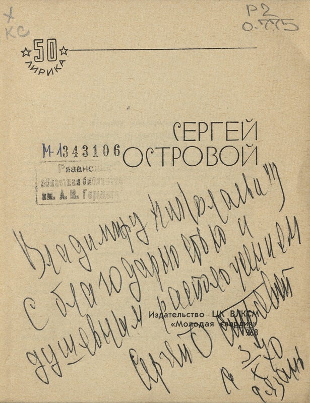 В «Коллекции автографов» Рязанской библиотеки имени Горького хранится сборник стихов Сергея Острового с автографом автора. Дарственная надпись адресована Владимиру Николаевичу Шестопалову (1924–1998) – государственному и общественному деятелю Рязанского региона, библиофилу.