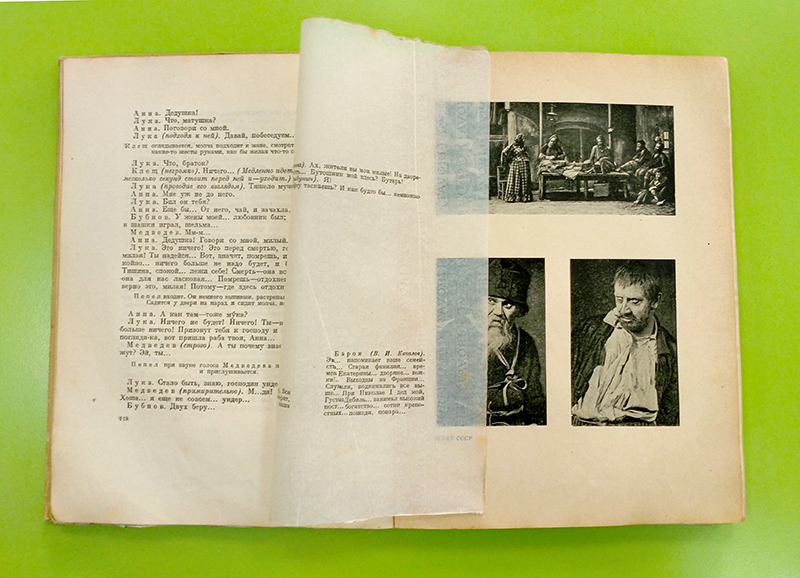 Примечательно, что иллюстрации закрыты папье-плюр (защищающими листами кальки), на которых есть надписи имен персонажей спектакля, фамилии актеров и цитаты из текста произведений.