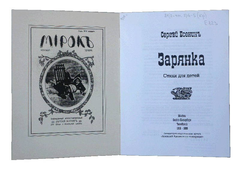 Особое место в каталоге занимает репринт-макет неосуществлённого детского сборника «Зарянка», задуманного поэтом в 1916 году. Макет книги, выпущенный в 1999 году Литературно-издательской артелью «Алексей Казаков со товарищи», позволяет современному читателю прикоснуться к одному из поэтических замыслов, не воплощённых при жизни Есенина.