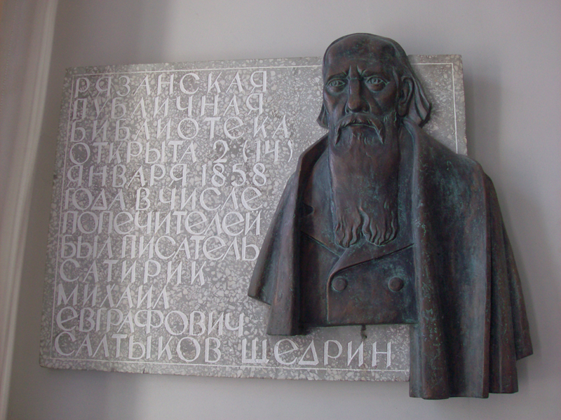 В фойе библиотеки установлена мемориальная доска, созданная в 1982 г. скульптором Ю. В. Крыловым, с барельефом писателя и словами: «Рязанская публичная библиотека открыта 2 (14) января 1858 года. В числе попечителей был писатель-сатирик Михаил Евграфович Салтыков-Щедрин».
