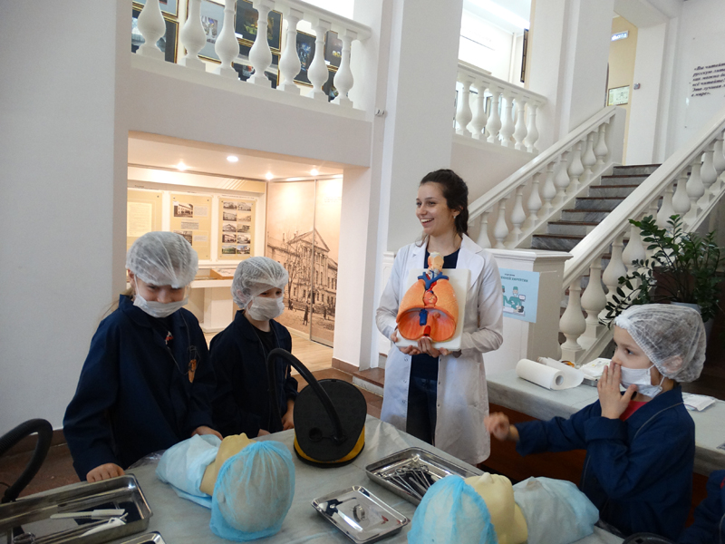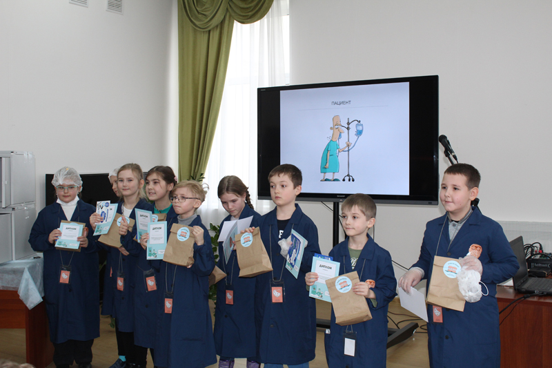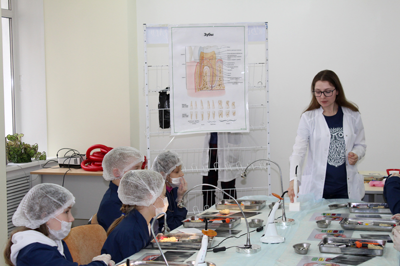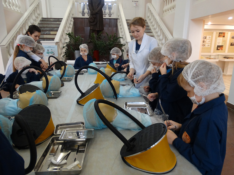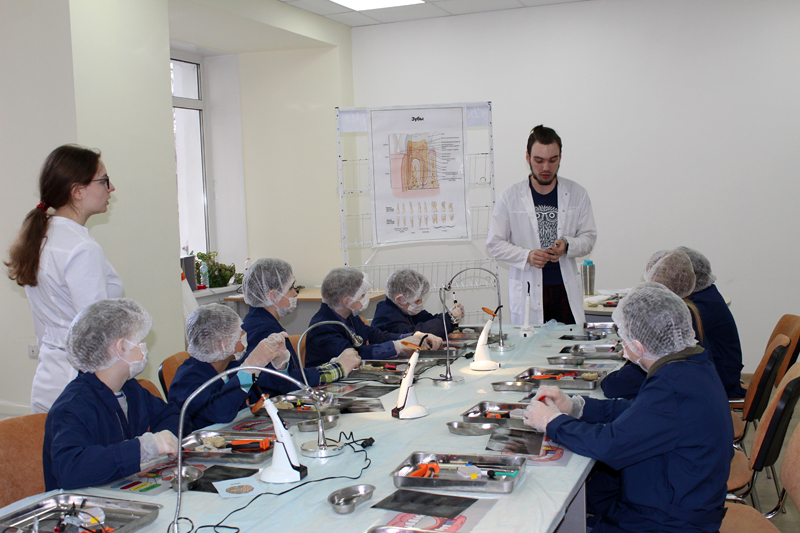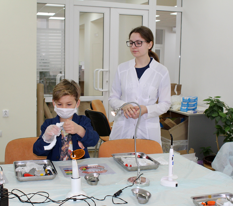 Для ребят 7–14 лет были оборудованы четыре лаборатории, где они перевоплотились в настоящих врачей. В лаборатории «Челюстно-лицевая хирургия» ребята разобрались в том, какие бывают зубы; узнали, что такое штифт и коронки, а также как их подбирают и устанавливают; нашли и удалили больной зуб на макете челюсти; изготовили имплант и установили его на место; сделали слепок вылеченной челюсти.