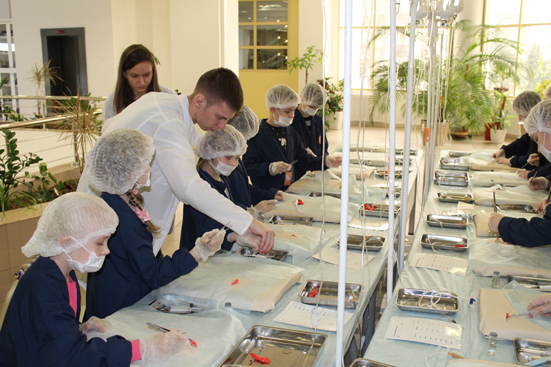 Завершилось перевоплощение во врачей в лаборатории «Хирургическая гастроэнтерология». Здесь ребята сделали анализ крови на наличие лейкоцитов; узнали, как устроен кишечник и удалили воспаленный аппендикс; разобрались, как правильно делать анестезию, и поставили капельницу, чтобы больной точно пошел на поправку.