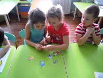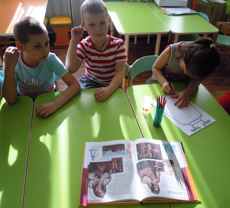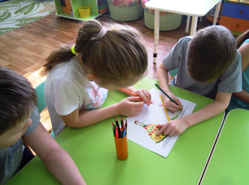 А затем детвора с огромным удовольствием раскрашивала сарафаны и рубахи. Дети рассматривали иллюстрации к русским народным сказкам «Царевна-лягушка», «Морозко», «Гуси-лебеди», играли в дидактические игры «Раскрась сарафан», «Атласные ленточки», «Одень куклу».