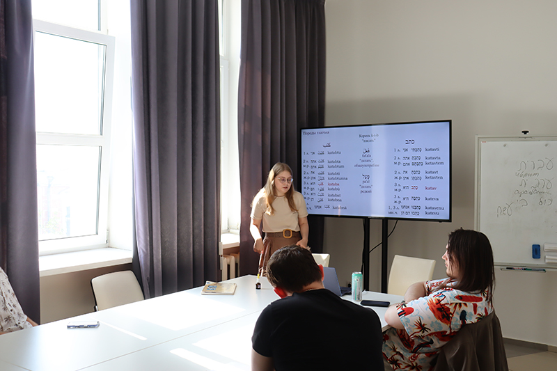 Занятие началось с чтения и анализа текста на иврите. В качестве грамматического компонента участникам было предложено изучение глагольных форм прошедшего времени.