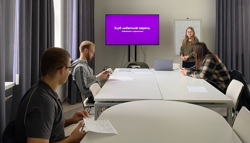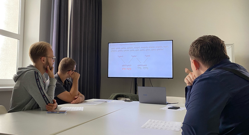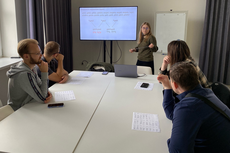 Заседание началось с разминки – участникам предложили угадать, к какому из семитских языков относится слово: ивриту, арабскому или аккадскому. Теоретическая часть занятия была посвящена знакомству с именными моделями иврита.