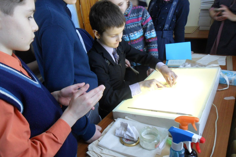Во время экскурсии ребята познакомились с работой центра, узнали, какие книги нуждаются в помощи, для чего существует служба консервации, как трудятся реставраторы и переплетчики. Детям рассказали о технологиях реставрации и переплета, продлевающих жизнь старой книги. Ребята поработали за реставрационным столом, станком для обрезки книжного блока и картонорубилке.