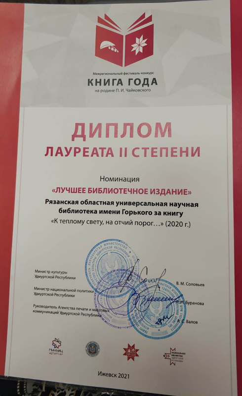 Рязанская областная универсальная научная библиотека им. Горького получила диплом лауреата конкурса II степени в номинации «Лучшее библиотечное издание» за книгу «К теплому свету, на отчий порог…». В сборнике представлены стихи Сергея Есенина о родном крае, родном селе, а также статьи известных исследователей биографии и творчества поэта Ольги Вороновой и Лидии Архиповой. Материал рязанского краеведа Юрия Блудова рассказывает о памятных местах в Рязани и мемориальных досках, связанных с пребыванием поэта. Книга иллюстрирована картинами известного художника Алексея Акиндинова.