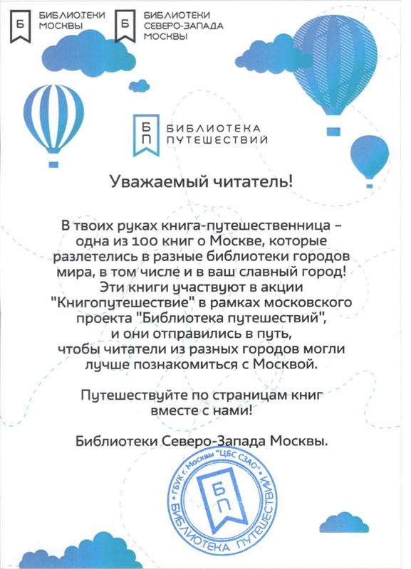 В рамках акции московского сетевого проекта библиотек «Библиотека путешествий» книга-путешественница из Москвы прибыла в Рязань. Цель акции городского проекта «Тематические библиотеки» – популяризация сведений о городах России и мира среди читателей. 100 книг о Москве отправились в путешествие в различные библиотеки городов мира.