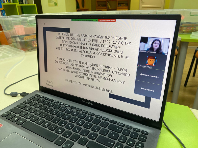 Ребята в режиме онлайн отвечали на вопросы о любимом городе и его знаменитых жителях. Для удобства участников вопросы были разбиты на темы: «Путешественники», «Летчики», «Ученые», «Писатели», «Художники», «Педагоги». На ответ отводилось полторы минуты.