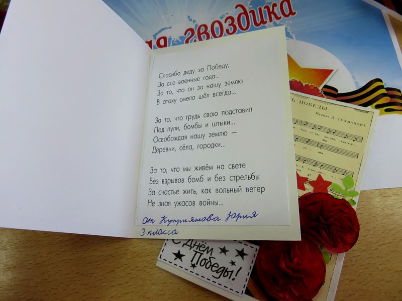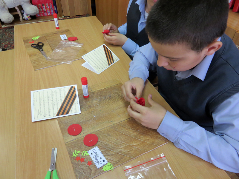 Мастер-класс начался с рассказа о победе нашего народа в Великой Отечественной войне. Ребята прочитали стихотворение «Что такое День Победы?» и вспомнили о том, какие ужасы принесла нашей стране война с фашистами. Затем весь класс приступил к изготовлению сувенира. Фоном для рукодельной открытки стала распечатанная песня «День Победы», а главным украшением – букет из красных гвоздик, который мальчишки и девчонки сделали из бумажных салфеток.