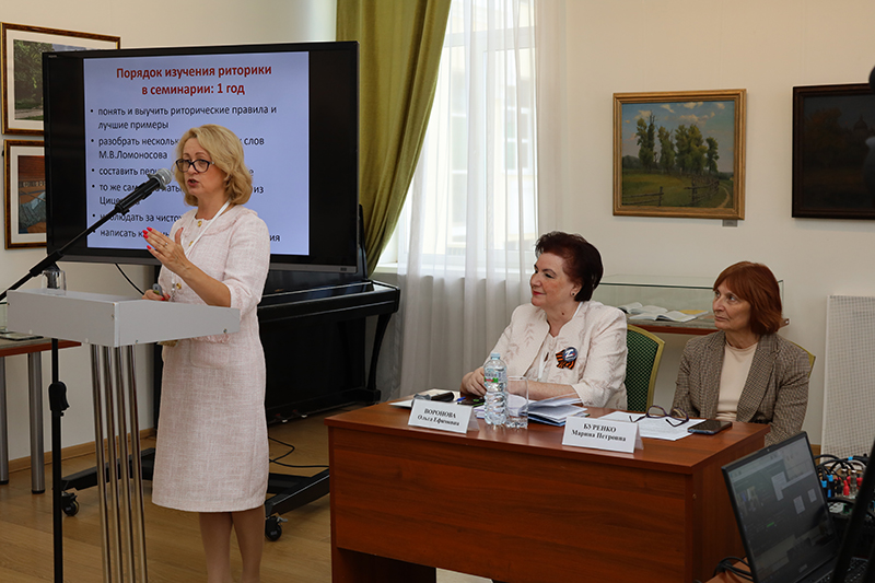 Елена Святославовна Богданова, профессор кафедры гуманитарных и естественно-научных дисциплин и методики их преподавания Рязанского государственного университета имени С.А. Есенина, доктор педагогических наук, осветила тему «Риторика в Рязанской губернии: история и традиции», поделилась своими изысканиями в архивных документах об истории образования в крае, в том числе о цифирной школе, открытии Первого риторического класса в Духовной семинарии в Рязани в 1743 году.