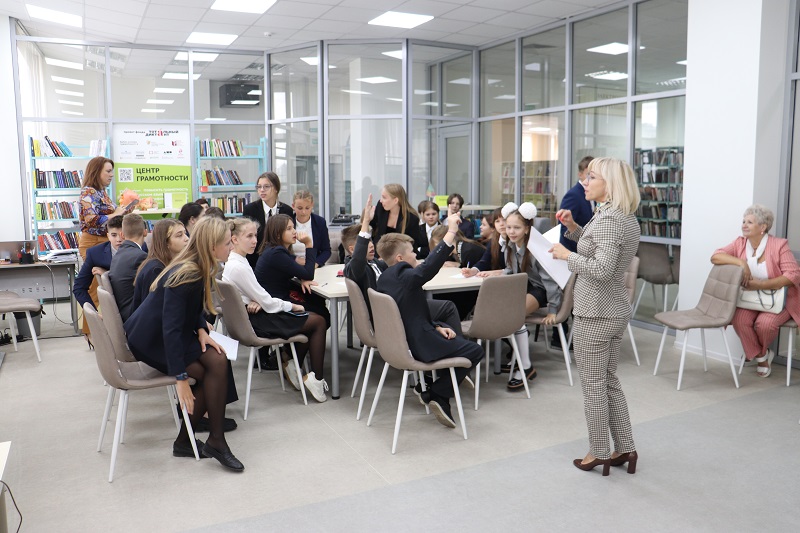 Заведующая Центром грамотности Ольга Уласевич поздравила учеников и их педагогов с Днем знаний, пожелав интересного и успешного учебного года, и пригласила всех, кто неравнодушен к русской словесности, познакомиться с современной литературой по русскому языку.
