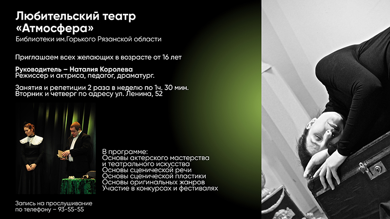 Любительский театр «Атмосфера» РОУНБ имени Горького приглашает всех желающих в возрасте от 16 лет в состав труппы