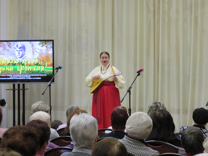 В прекрасном исполнении коллектива прозвучали всеми любимые песни рязанских композиторов – Евгения Попова, Александра Ермакова, Александра Аверкина, Юрия Ананьева на стихи Сергея Есенина: «Россия поклоняется Есенину», «На лазоревые ткани», «Ты меня не любишь, не жалеешь» и другие.