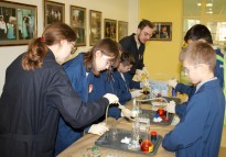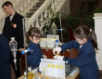 Всех участников разделили на команды «Карбонаты кальция», «Перманганаты калия», «Гидроксиды водорода» и «Хлориды натрия», каждая из которых побывала в четырех лабораториях. Ребята с большим интересом изучали свойства химических субстанций, получали простые и сложные вещества, проводили эксперименты по экстракции, фильтрованию. Для родителей была подготовлена отдельная программа – увлекательная лекция-викторина о великих химических открытиях и об известных ученых-химиках.