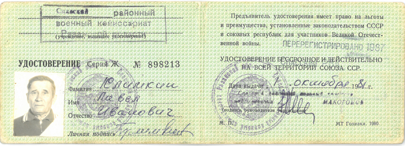 Дед призывался на фронт из Спасского РВК. С июня 1941 года до апреля 1942 служил в 81-м дорожно-эксплуатационном батальоне шофером на автомашине ГАЗ-АА, в последующем – начальником заправочного пункта 1-й дорожно-комендантской роты. Воевал на Западном, Ленинградском, Волховском и 3-м Прибалтийском фронтах. Не любил дед рассказывать о войне, только и помнят все, что служил он на знаменитых «Катюшах», был водителем грузовика на ленинградской Дороге жизни. Награжден медалями «За оборону Ленинграда» и «За боевые заслуги», орденом Отечественной войны II степени.