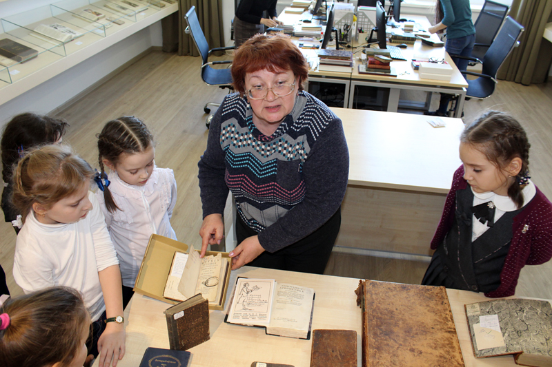 Завершила мероприятие экскурсия по новому библиотечно-информационному комплексу. Ребята посетили сектор сканирования, где сотрудники продемонстрировали перевод документов в электронный вид. Сотрудники центра редких и ценных изданий рассказали о самых ранних и уникальных книгах, хранящихся в библиотеке, показали старинные фолианты и книги-малютки, особенно понравившиеся детям.