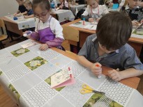 Мальчишки и девчонки с большим энтузиазмом принялись за создание маленьких шедевров. Для работы им потребовался цветной картон, дизайнерская бумага, стразы, клей и огромная любовь к самому важному на Земле человеку.