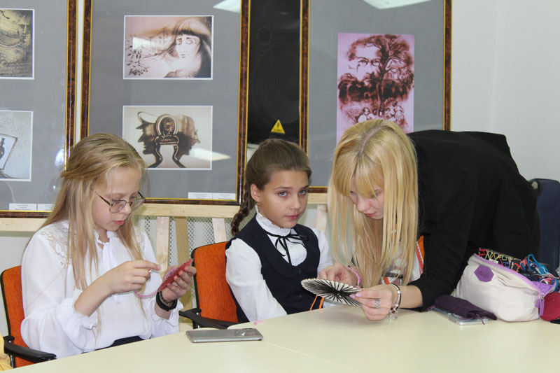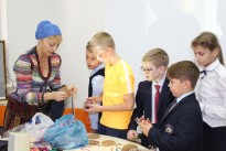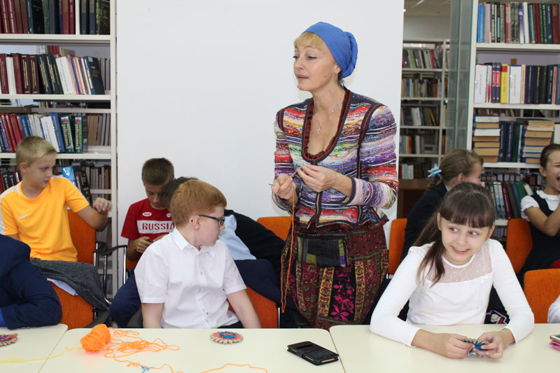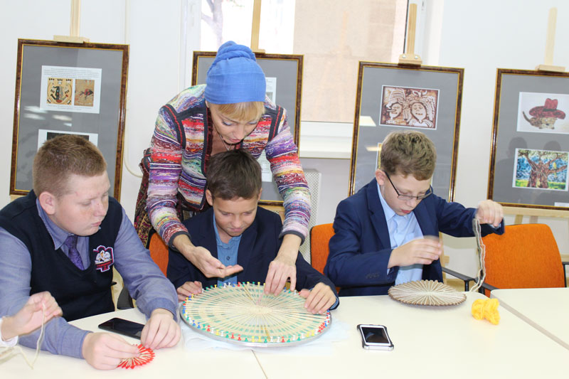 Детский мастер-класс по круговому ткачеству привлек юных участников своей креативностью и самобытностью. Лучшими ткачами во все времена были мужчины. И наши мальчики доказали это. Наравне с девочками терпеливо и тщательно они плели круговые элементы, шнуры и модные фенечки. Татьяна Александровна подарила самым активным участникам свою книгу «Рукотворные чудеса».