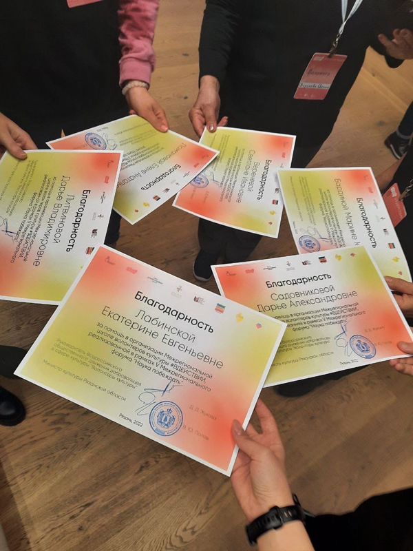 Межрегиональная школа волонтеров культуры «#ВДЕЙСТВИИ» закрылась концертом, прошедшим в Горьковском зале библиотеки. В напутственным словом и пожеланием воплотить в жизнь созданные проекты к собравшимся обратилась председатель Общественной палаты Рязанской области, председатель областного Совета женщин, директор библиотеки Наталья Николаевна Гришина. Вместе с консультантом отдела поддержки молодежных и общественных инициатив регионального министерства образования и молодежной политики Ольгой Александровной Медведевой Наталья Николаевна вручила участникам школы волонтеров культуры «#ВДЕЙСТВИИ» памятные сертификаты.
