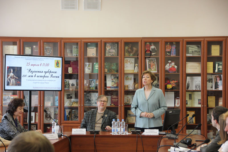 Доктор исторических наук, профессор Рязанского государственного университета имени С.А. Есенина П.В. Акульшин и директор библиотеки Н.Н. Гришина возглавили президиум студенческой конференции, прошедшей в РОУНБ им. Горького. В своем приветственном слове Наталья Николаевна рассказала о мероприятиях, посвященных этой дате, которые проводятся в регионе и областной научной библиотеке имени Горького. Прозвучало Приветствие главы Российского императорского дома, великой княгини Марии Владимировны в связи с 240-летием учреждения Рязанской губернии.